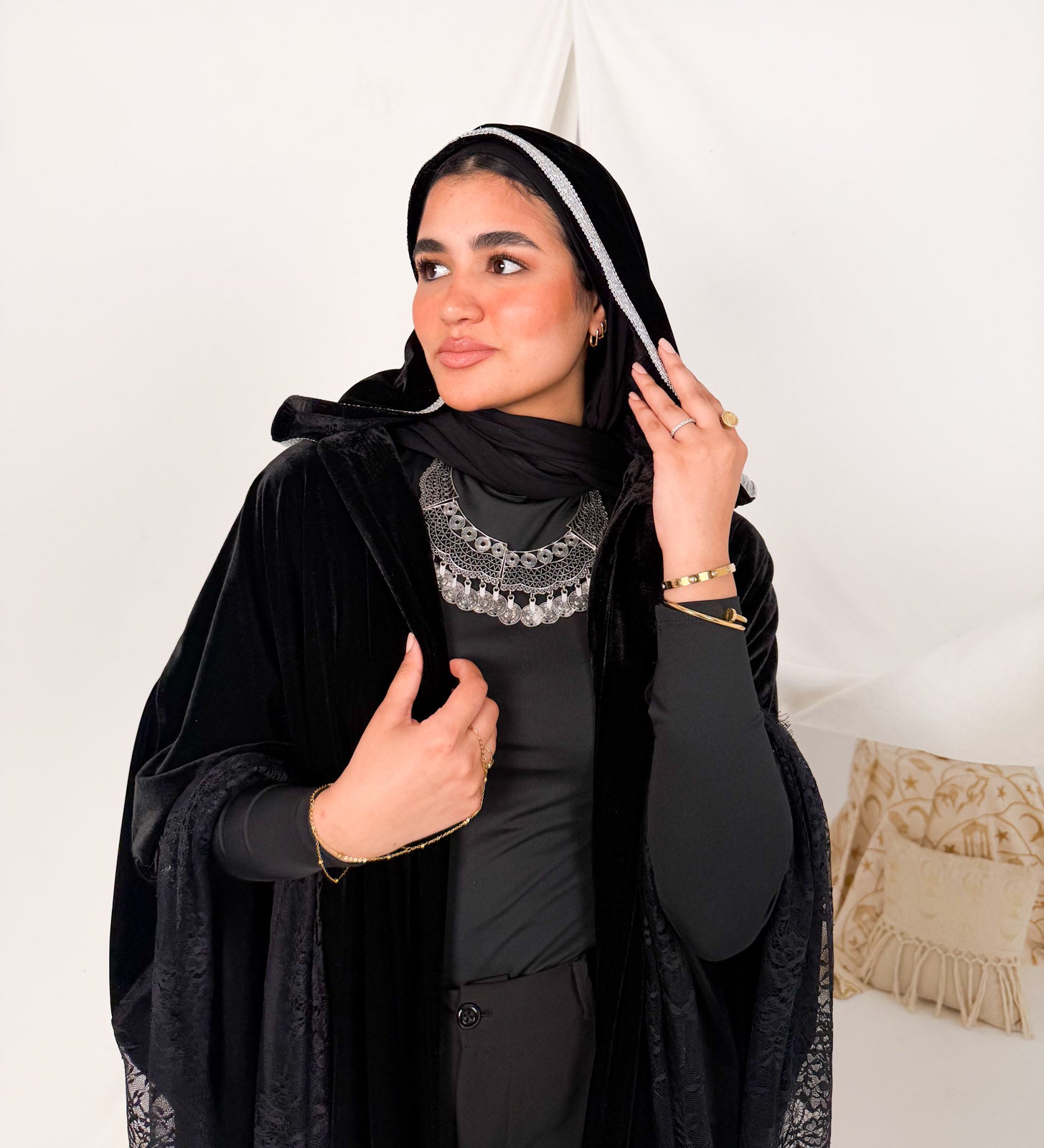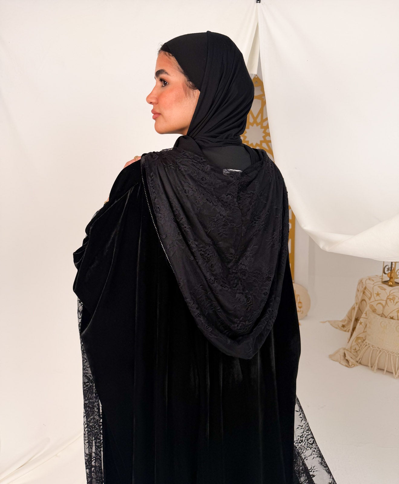 Hooded black velvet with black lace kaftan